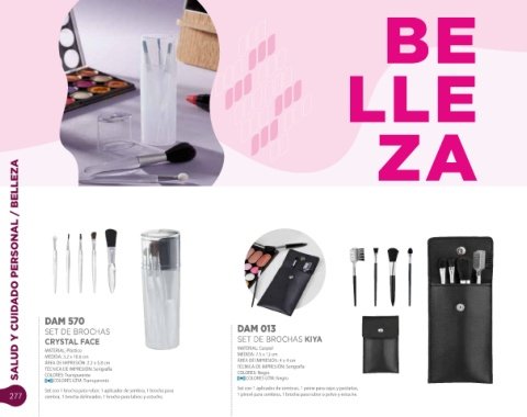 277 som bra, 1 brocha delineador, 1 brocha para labios y estuche. 1 pincel para som bras, 1 brocha para rubor o polvo y estuche.