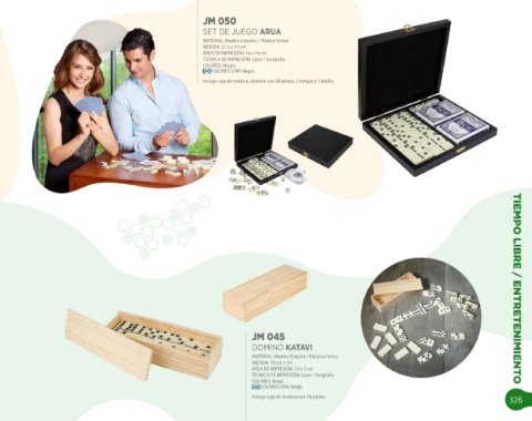 Incluye caja de m adera, dom inó con 28 piezas, 2 barajas y 5 dados.
