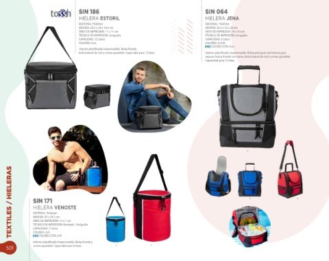 bolsa lateral de red y correa ajustable. Capacidad para 10 latas. Interior plastificado im p erm eable. Bolsa principal, red interna para